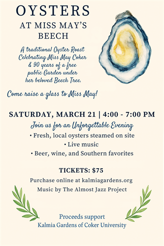 Kalmia Gardens Oyster Roast March 21, 2026Event Description:Kalmia Gardens of Coker University is hosting its Oyster Roast Fundraiser, celebrating Miss May Coker and 90 years of being a free public garden, on March 21, 2026 from 4 p.m. ? 7 p.m. For $75 a ticket, enjoy mounds of steamers, cold craft beer, flowing wine, live music, a huge porch full of incredible foods (for you land lovers), as well as a mix of some mighty fine folks, all in the beauty of Kalmia Gardens. Get your tickets before they sell out!Location:Kalmia Gardens of Coker University