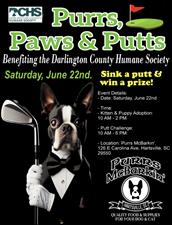 Event Description:June 22nd from 10 AM to 6 PM “ Purrs, Paws & Putts” benefitting the Darlington County Humane Society.Great prizes for getting a hole in one! 100% of money generated from the event will go to DCHS so that they can continue helping homeless pets.Location:Purrs McBarkin'