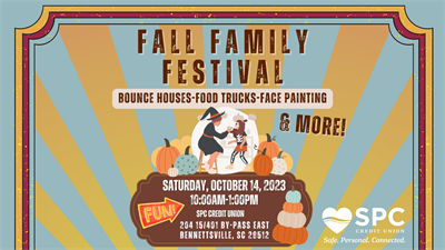 Stop by SPC Credit Union's Bennettsville office on Saturday, October 14 for a Fall Family Festival! This FREE event will feature bounce houses, karaoke, face painting, food trucks...& more!PLUS, the first 50 attendees will receive a $10 voucher to present to a food truck on site!SPC Credit Union Fall Family Festival...Date and Time