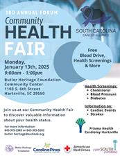 The Butler Heritage Foundation is excited to announce its 3rd Annual Community Forum Health Fair. Join us on Monday, January 13, 2025, from 9:00 a.m. to 1:00 p.m., at the Butler Heritage Foundation at 1103 S 6th St, Hartsville, SC.